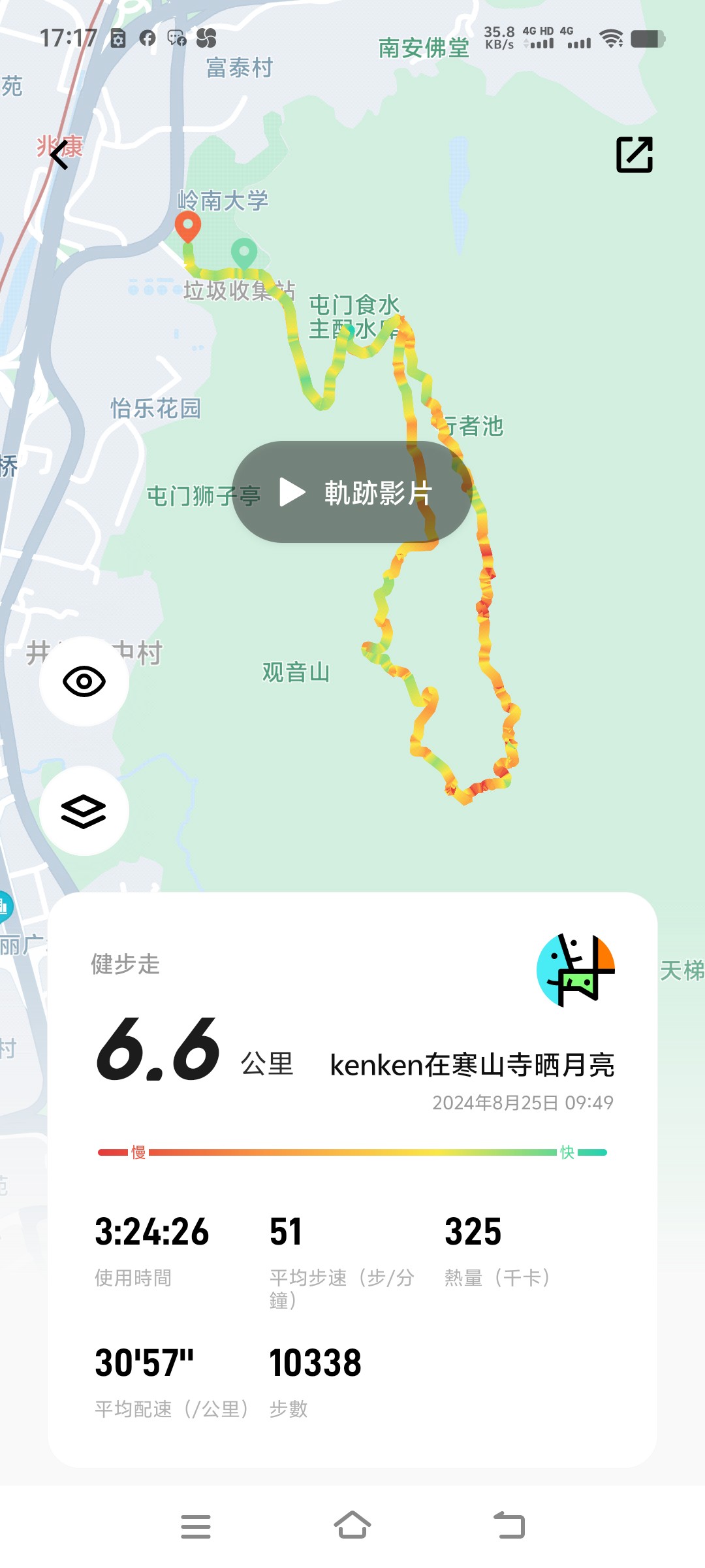 路線:屯門嶺南大學→富地路→虎地上村→虎地郊遊徑→荒僻山徑→洪水坑→洪水坑水塘→藍地石礦場→南安佛堂→富泰村→兆康。